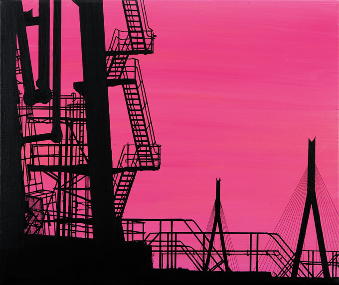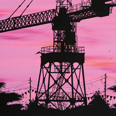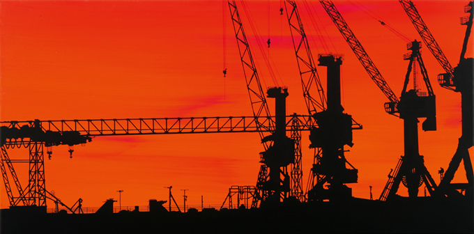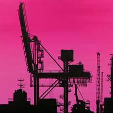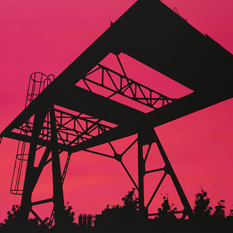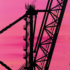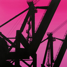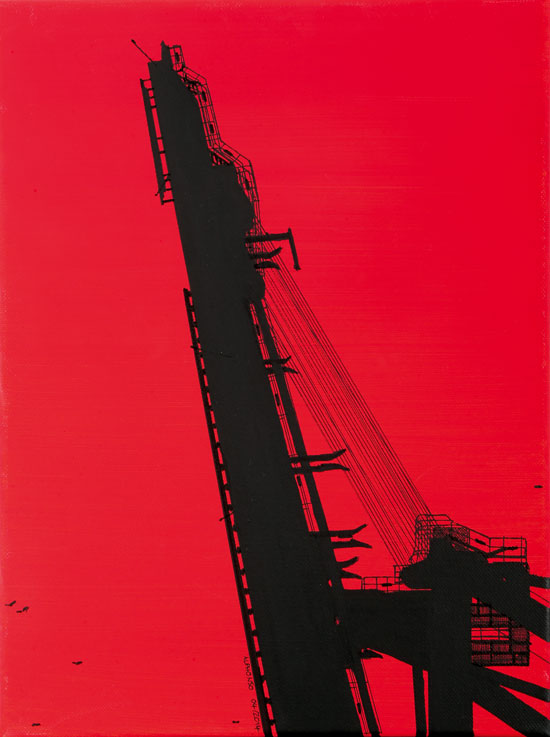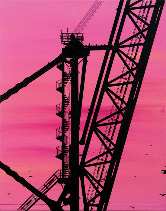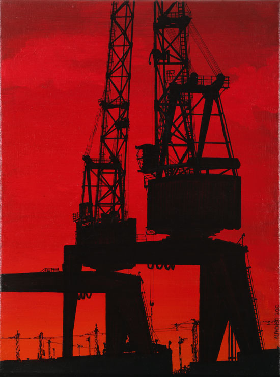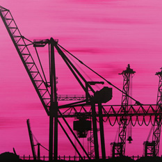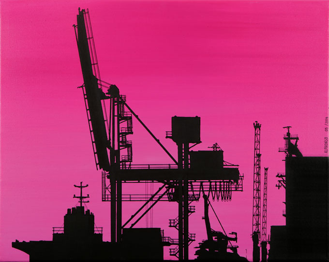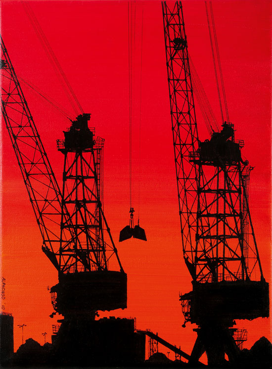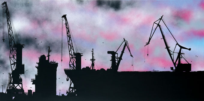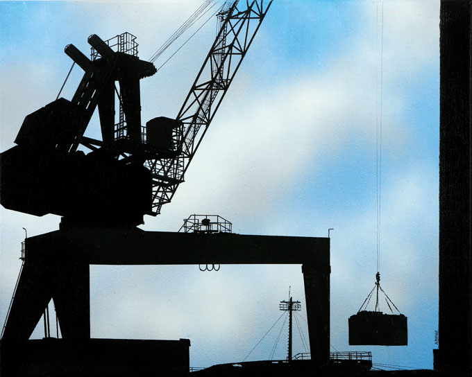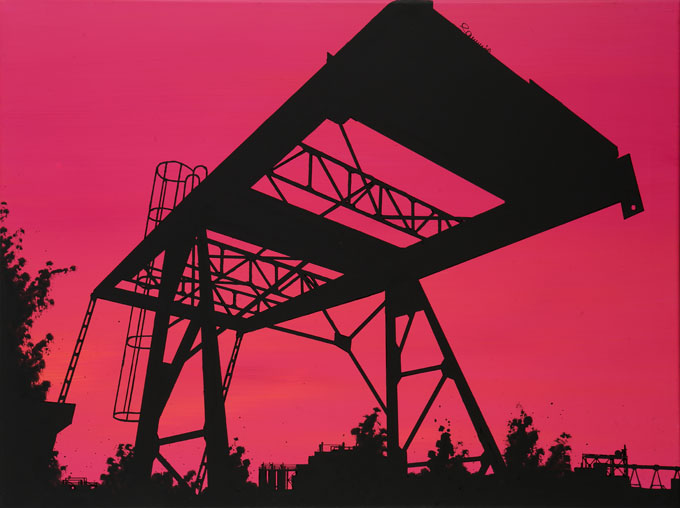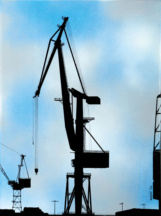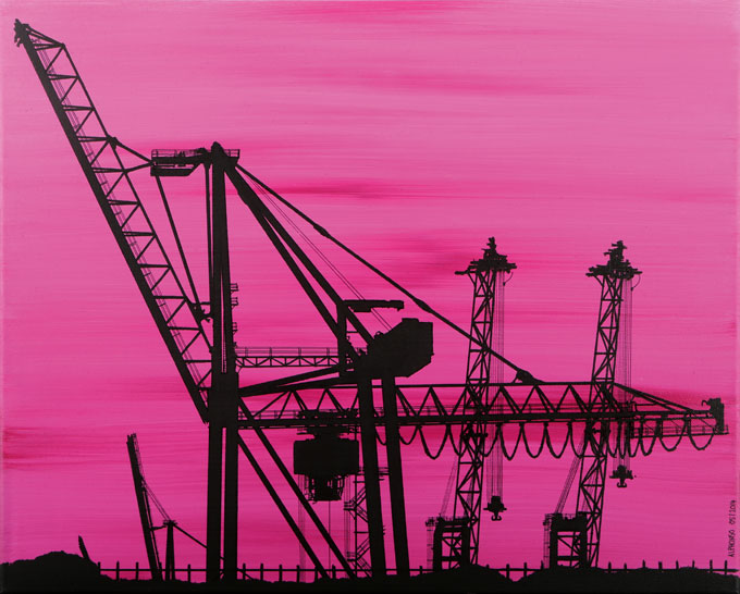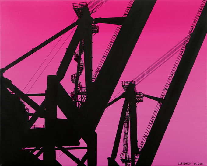 Die Leidenschaft zu Industrielandschaften ist in den Werken des jungen Hamburger Künstlers Janus Alphonso nicht zu übersehen.  Der Fokus auf Kräne und Brücken spielt hierbei eine große Rolle und wird in besonderer Art und Weise malerisch dargestellt.