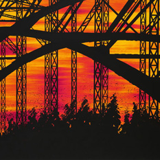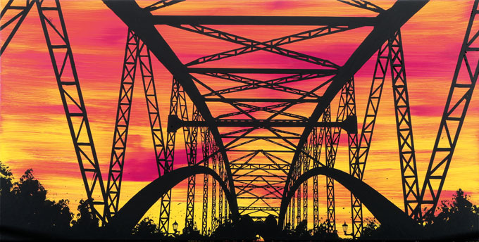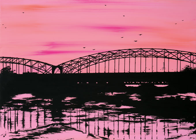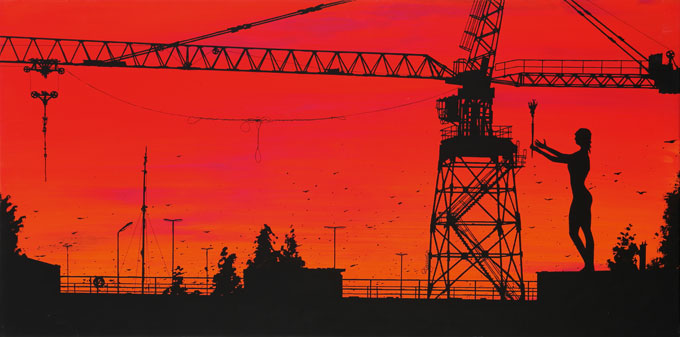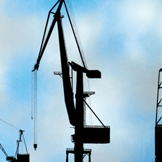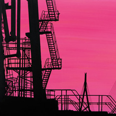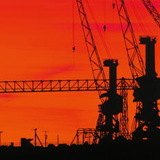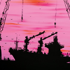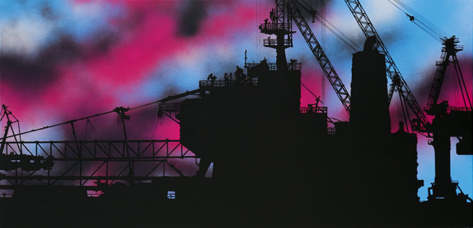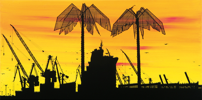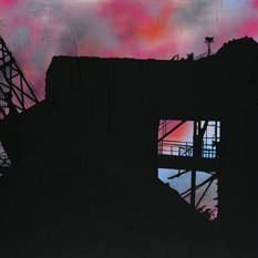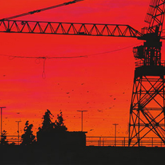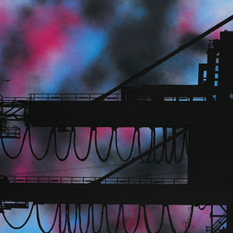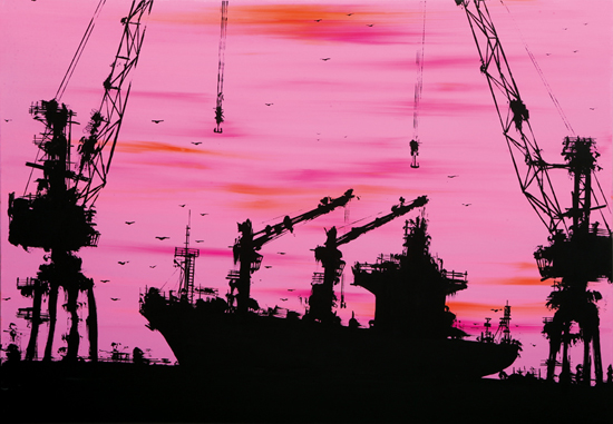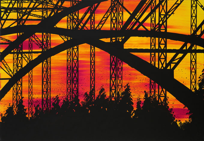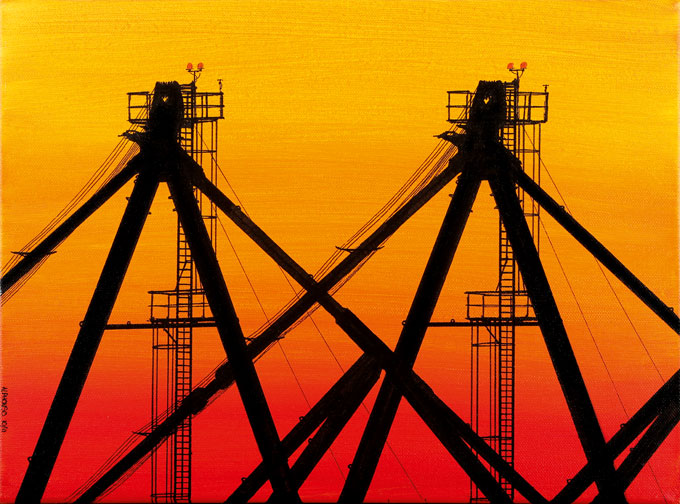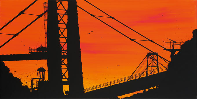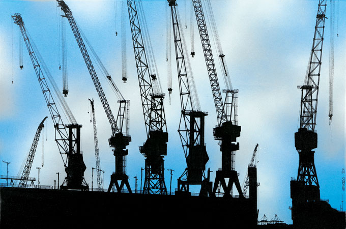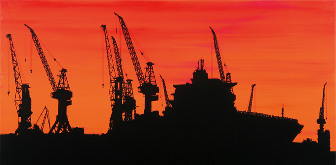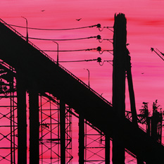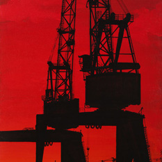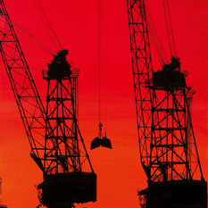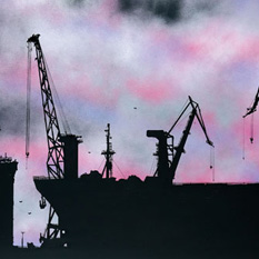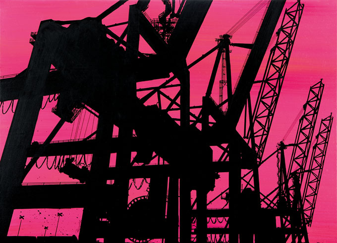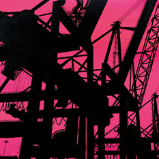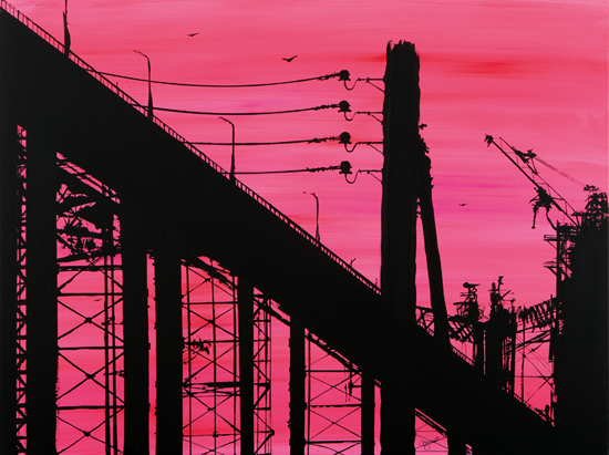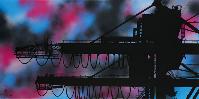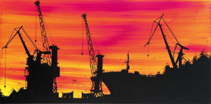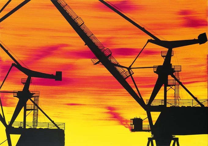 Die Leidenschaft zu Industrielandschaften ist in den Werken des jungen Hamburger Künstlers Janus Alphonso nicht zu übersehen.  Der Fokus auf Kräne und Brücken spielt hierbei eine große Rolle und wird in besonderer Art und Weise malerisch dargestellt.